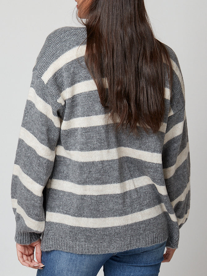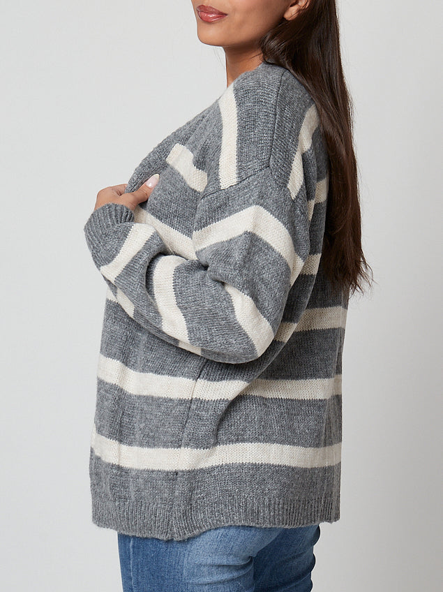 Chaleta abierta de punto, tipo cardigan. Gris clarito y blanco.