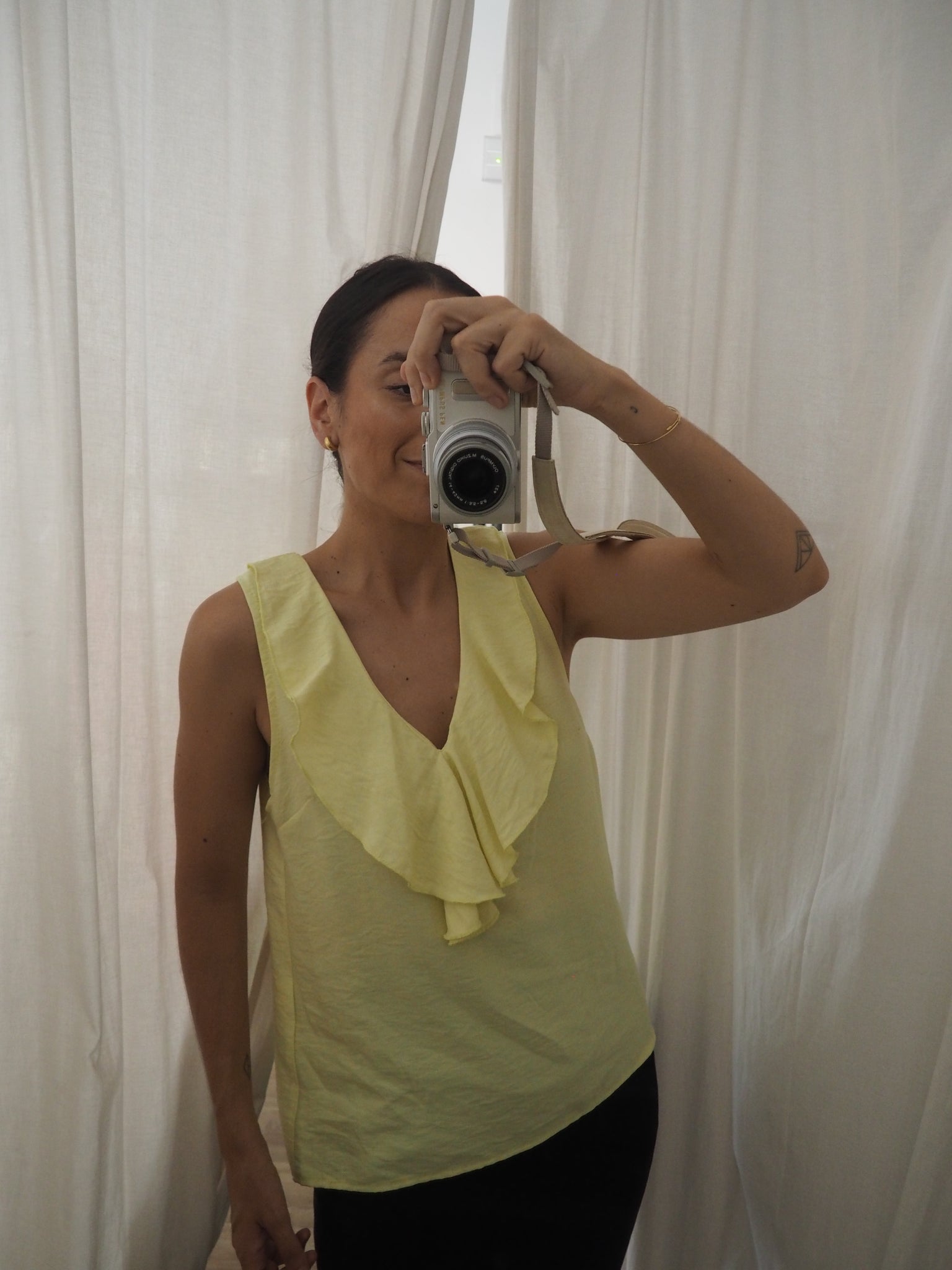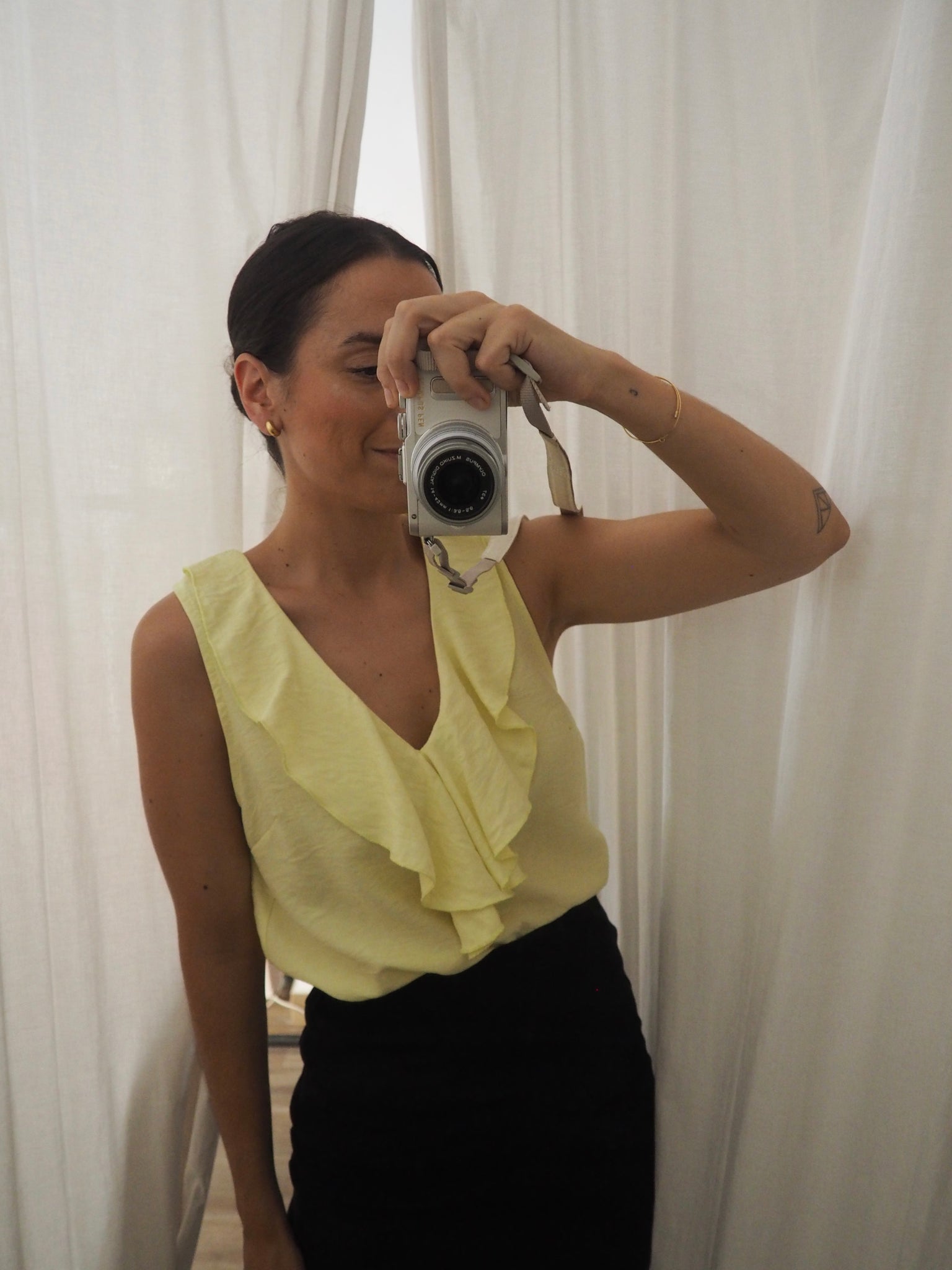 Blusa amarilla sin mangas con escote en pico y detalles de volantes