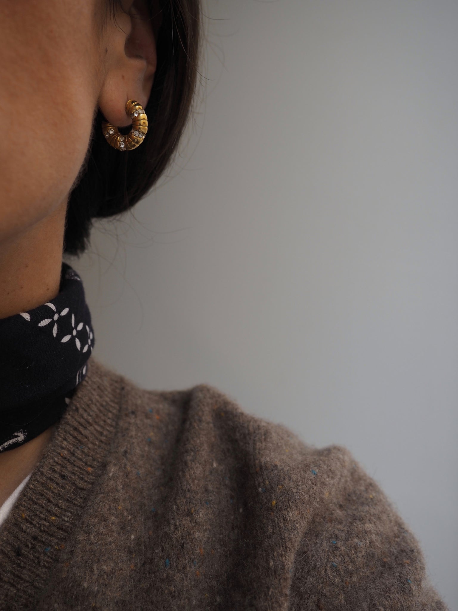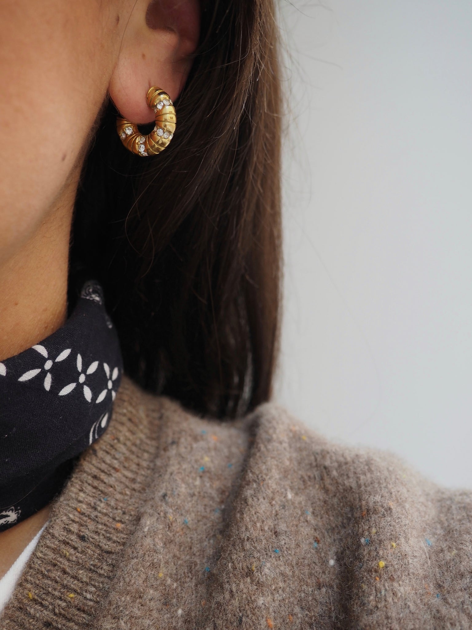 Pendientes aros gorditos labrados y con incrustaciones de circonitas. Muy favorecedores. Cierre clásico con tuerca.