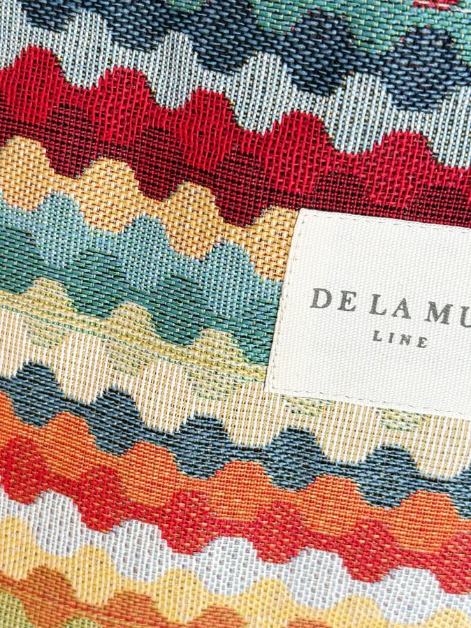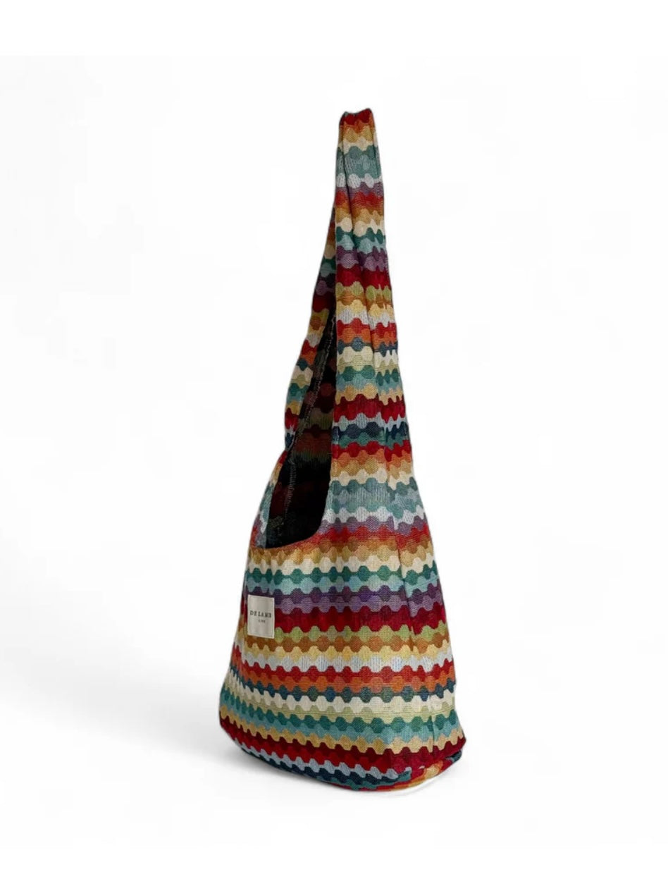 Bolsa ovalada con asas para llevar al hombro. Con un tejido grueso de jacquard con estampado geométrico multicolor. Para su correcto mantenimiento se aconseja lavarlo en frío a mano y no utilizar secadora.