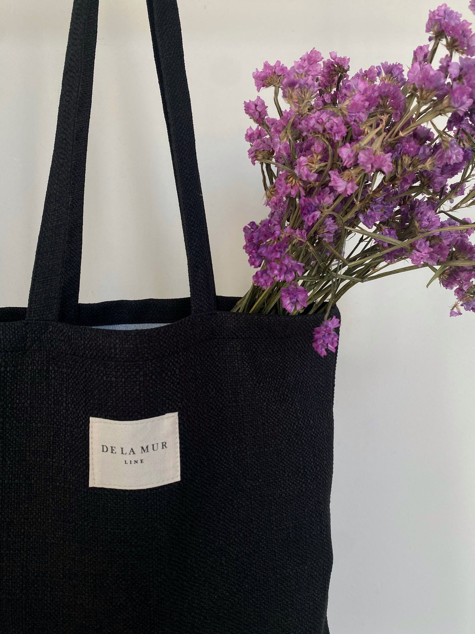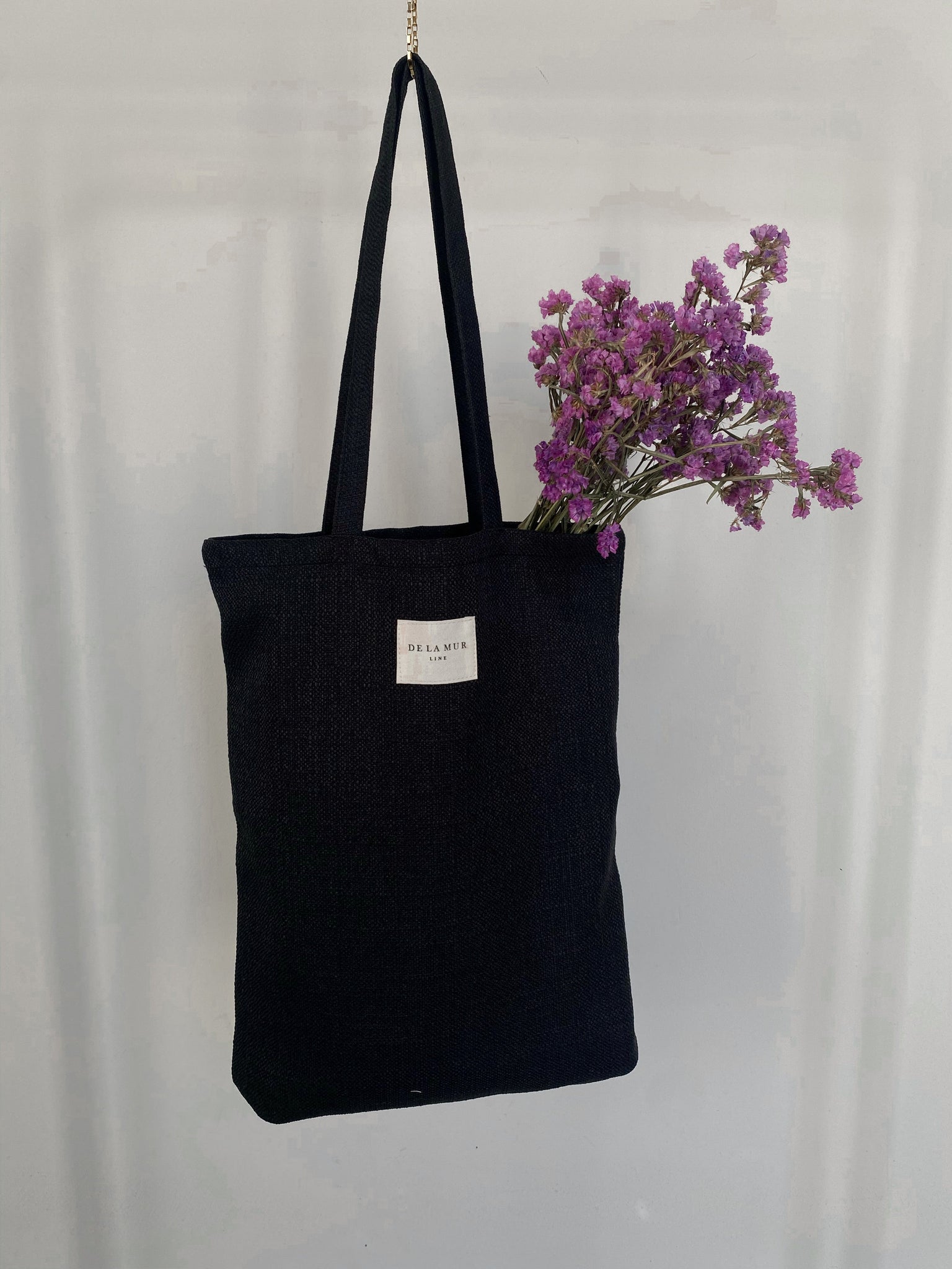 Bolsa “tote bag” con asas para llevar al hombro. Con tejido grueso de color negro. Para su correcto mantenimiento se aconseja lavarlo en frío y no utilizar secadora.
