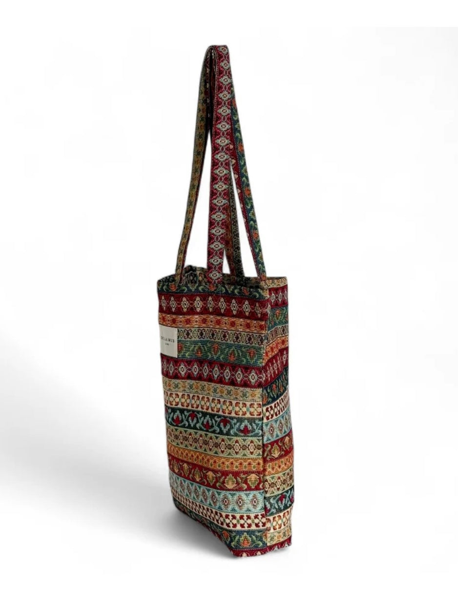 Bolsa "tote bag" con asas para llevar al hombro. Con tejido grueso de jacquard con estampado geométrico multicolor. Para su correcto mantenimiento se aconseja lavarlo en frío y no utilizar secadora.