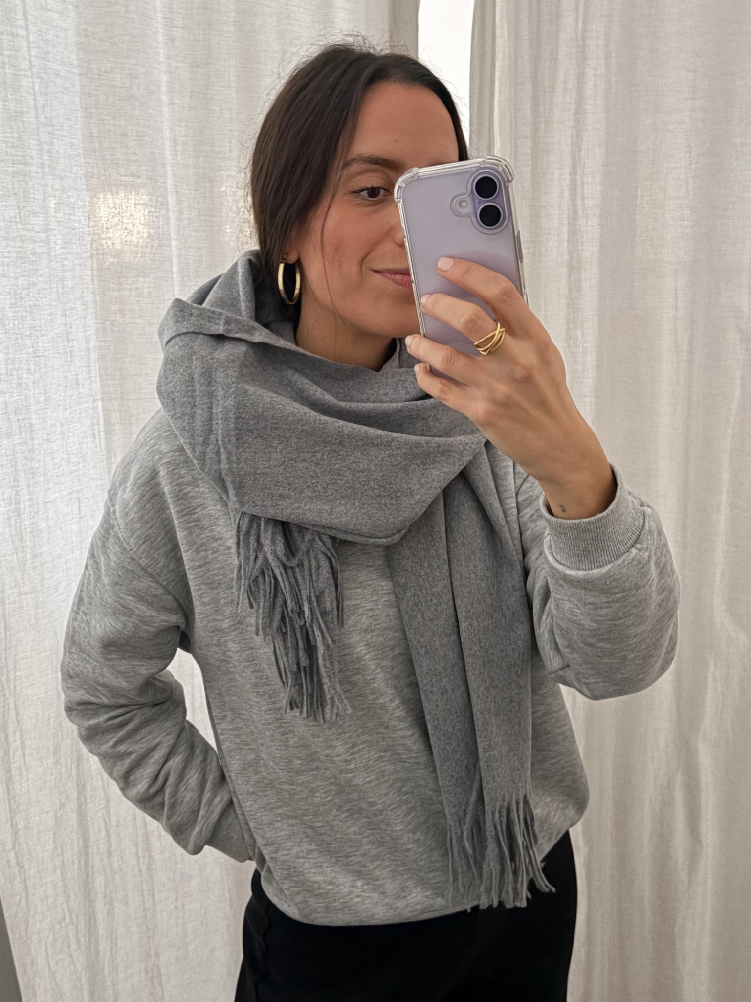 Bufanda lisa con acabado de flecos en color gris. Un complemento básico y clásico perfecto para otoño e invierno. Ideal para llevar en el cuello o como estilo capa. Nos gusta por su color que pega con todo.