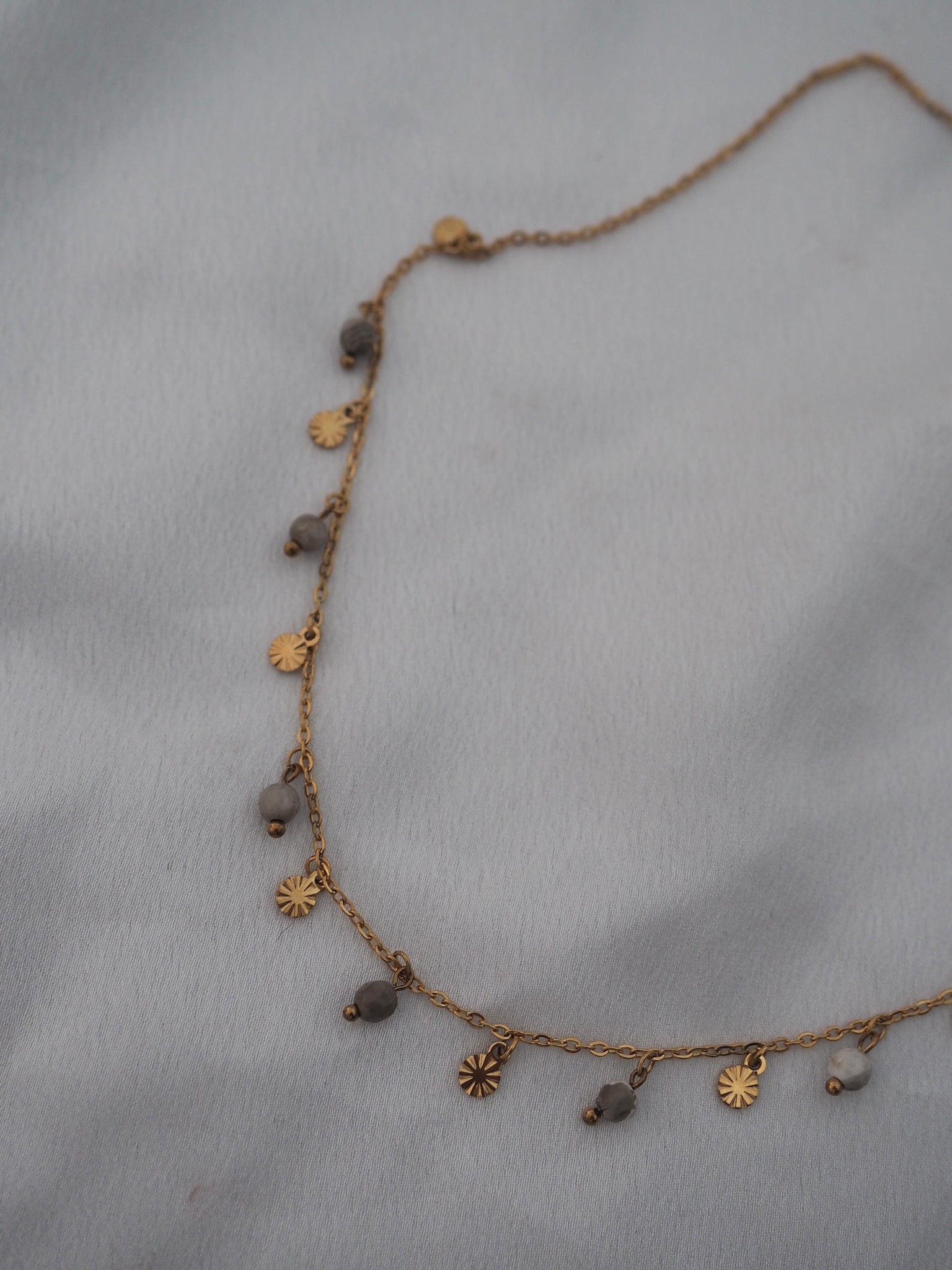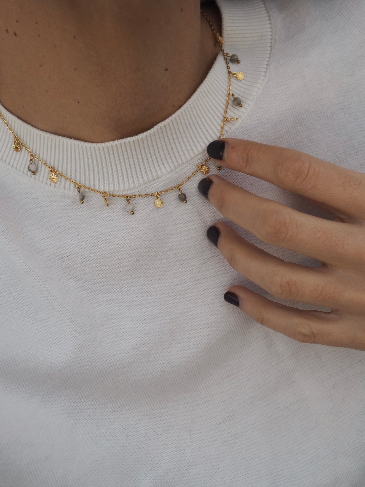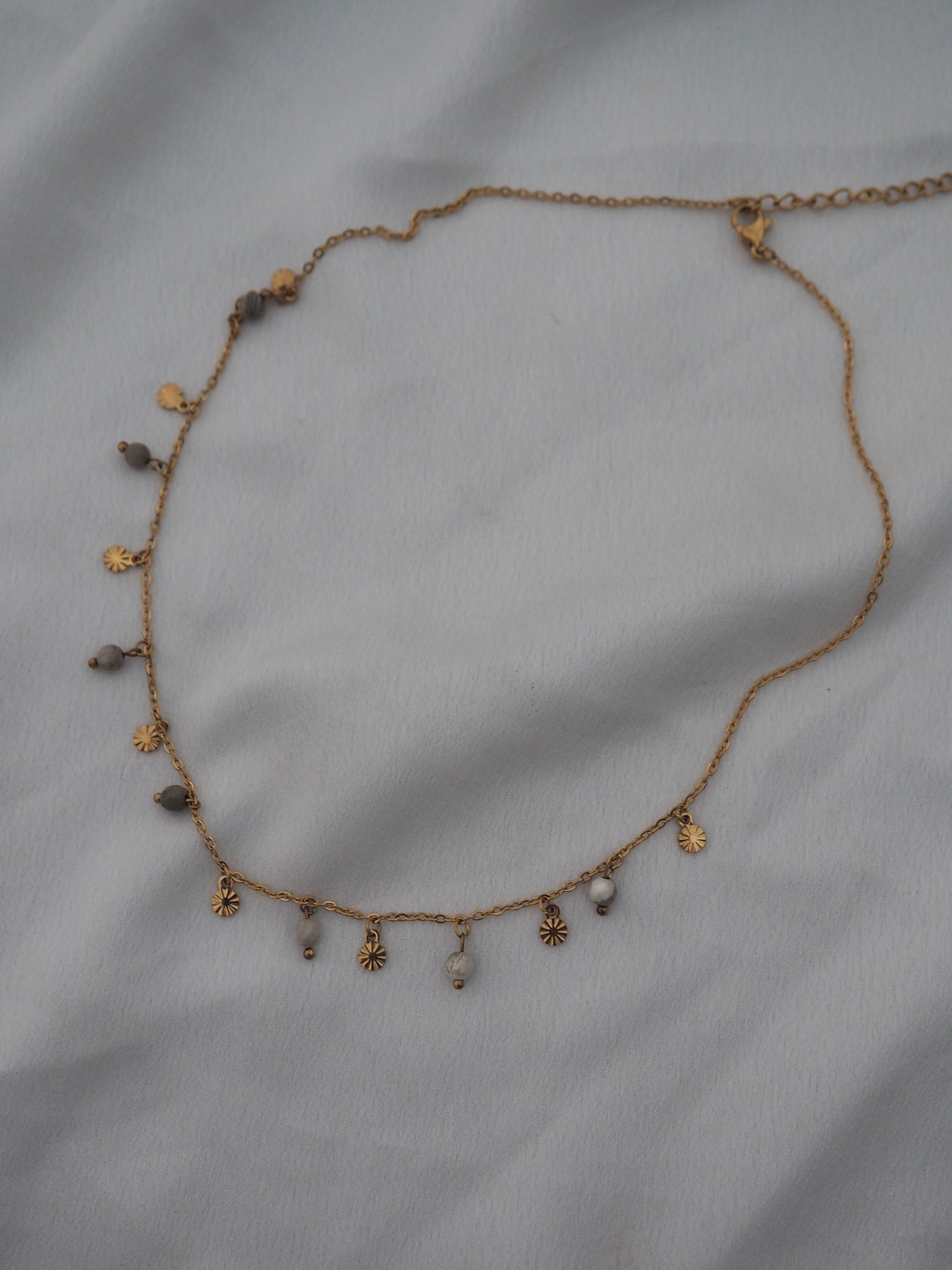 Collar de cadena clásica reforzada con chapitas aternadas con piezas acrílicas grises cobinadas con blanco.