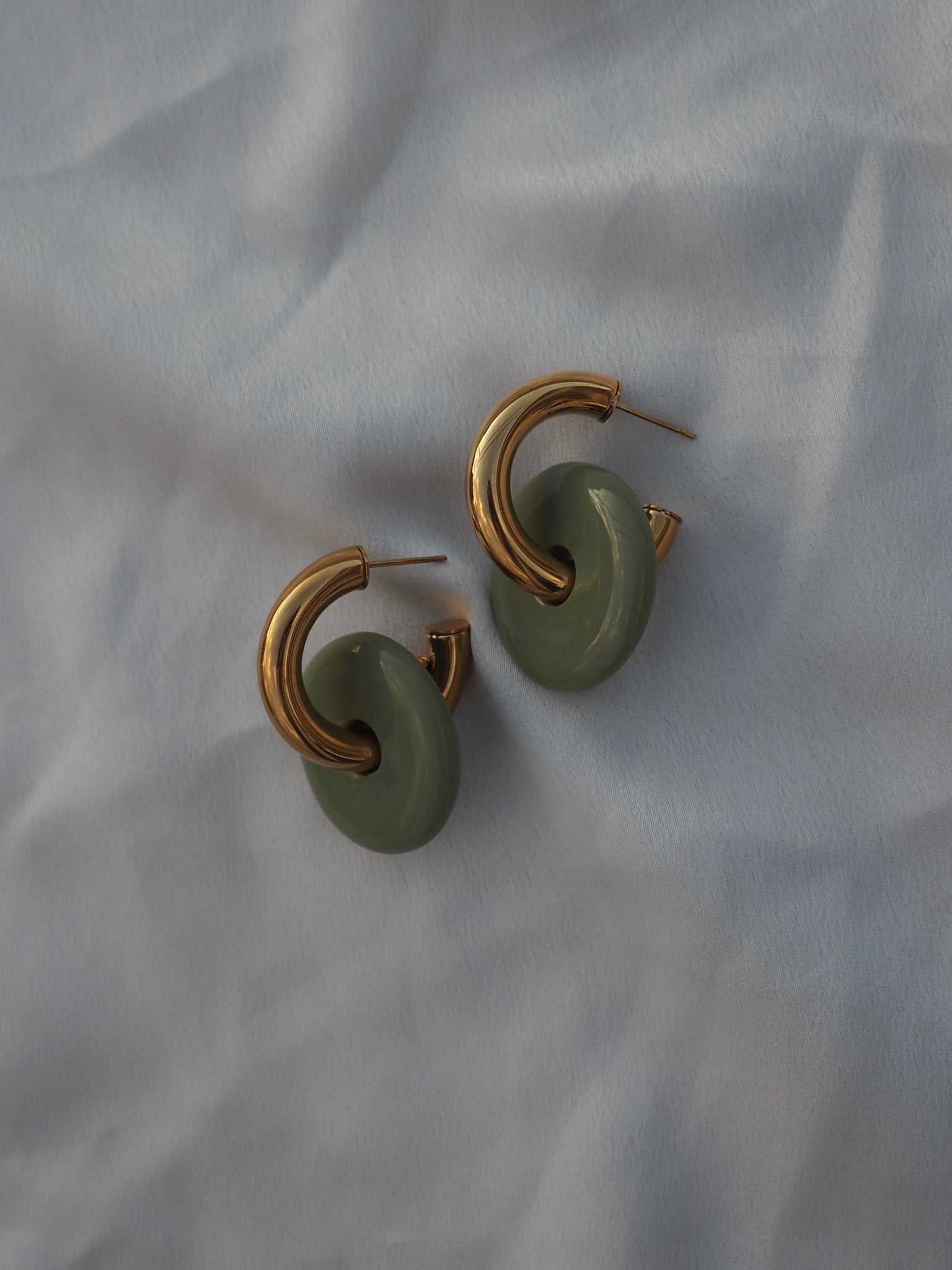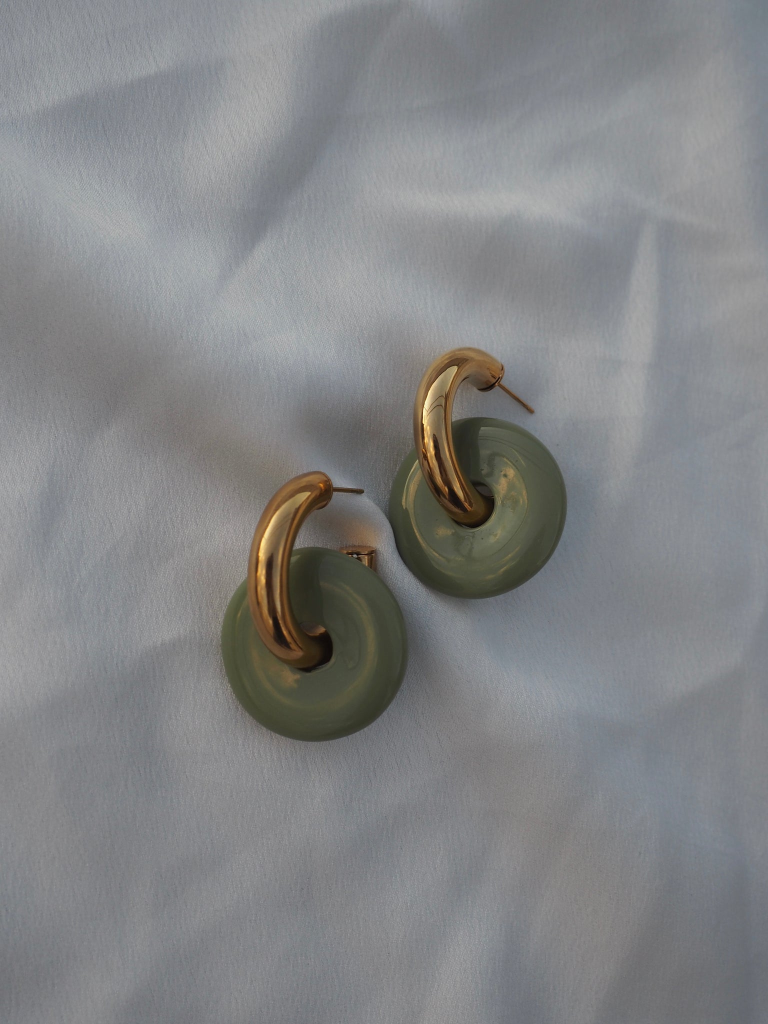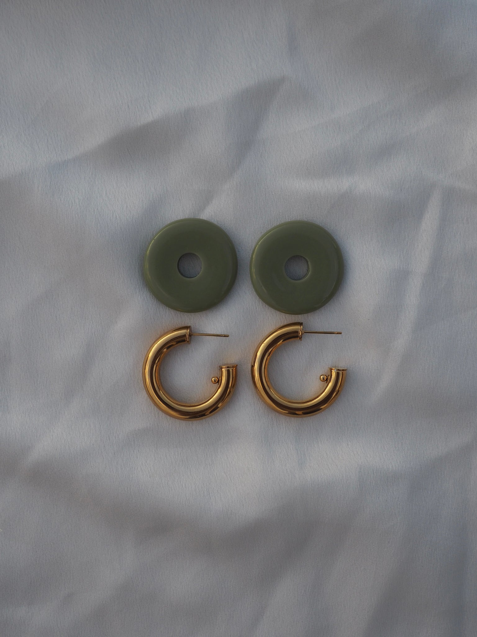 Pendientes aros gorditos (pero huecos, nada pesados), anchitos con cierre de tuerca, y pieza de quita y pon acrílica en un verde suave muy bonito.