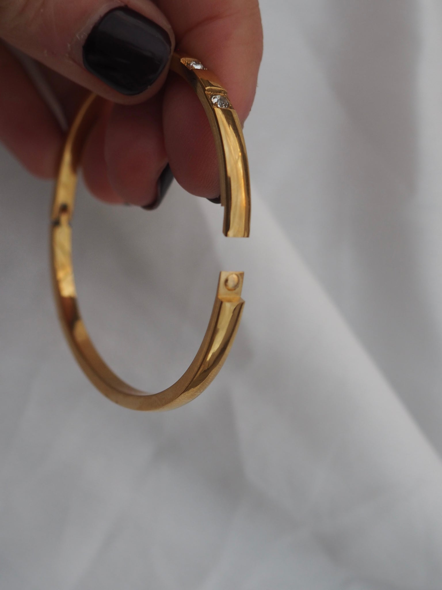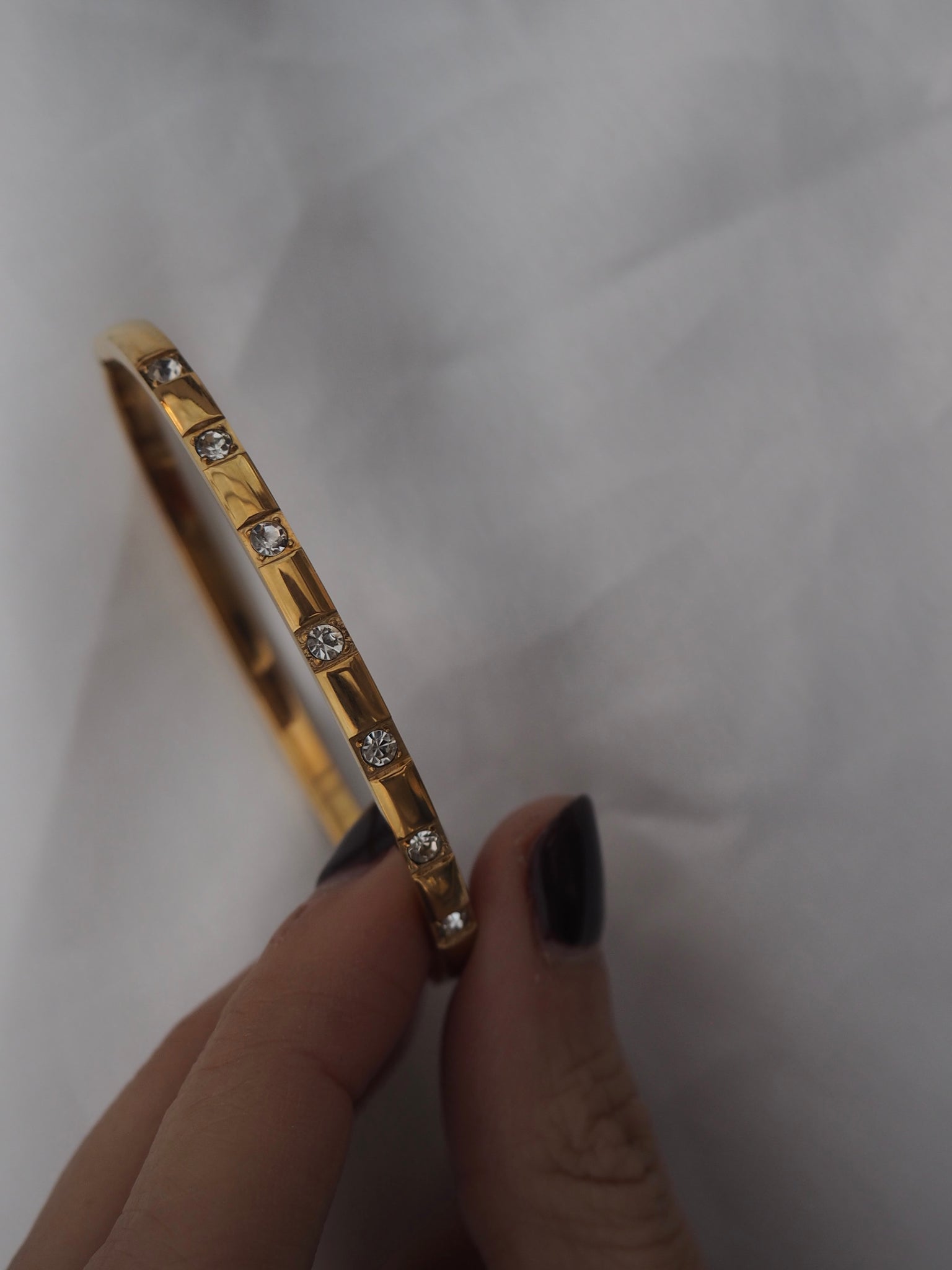 Pulsera rígida de caña, perfecta para llevar sola o acompañarla con más. Cierre fácil de toda la vida. Es ligeramente ovalada. Lleva 5 circonitas incrustadas.