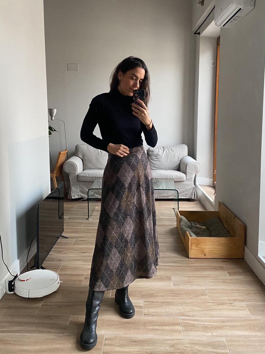 Falda elástica larga con cintura elástica y vuelo. Esmpado clásico de rombos en tonos camel y verde oscuro.