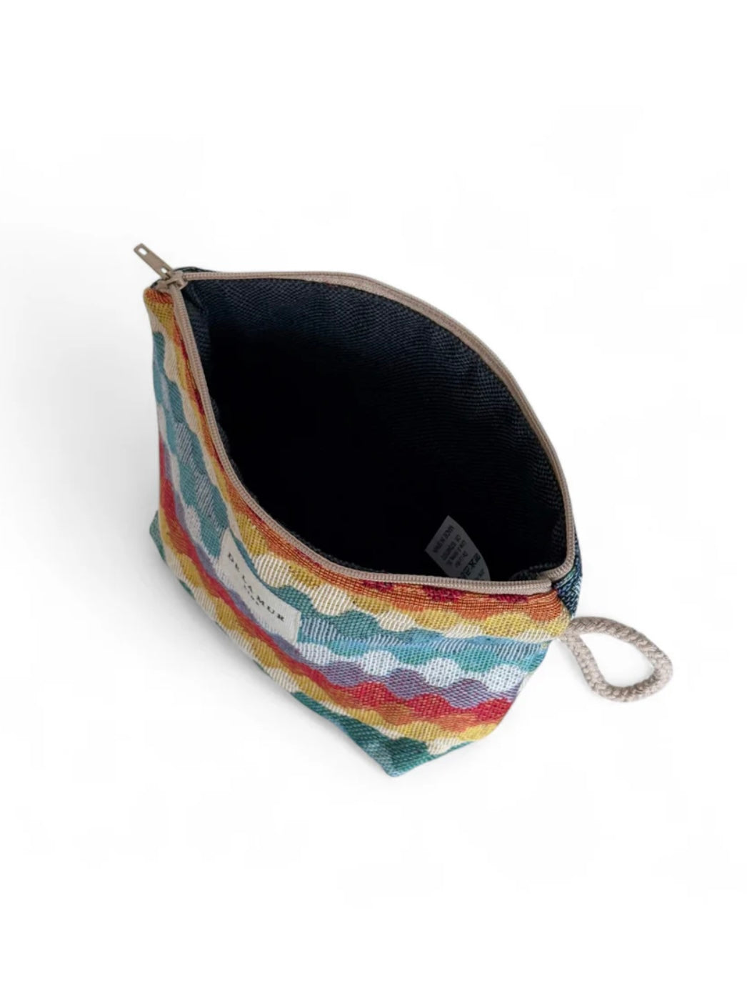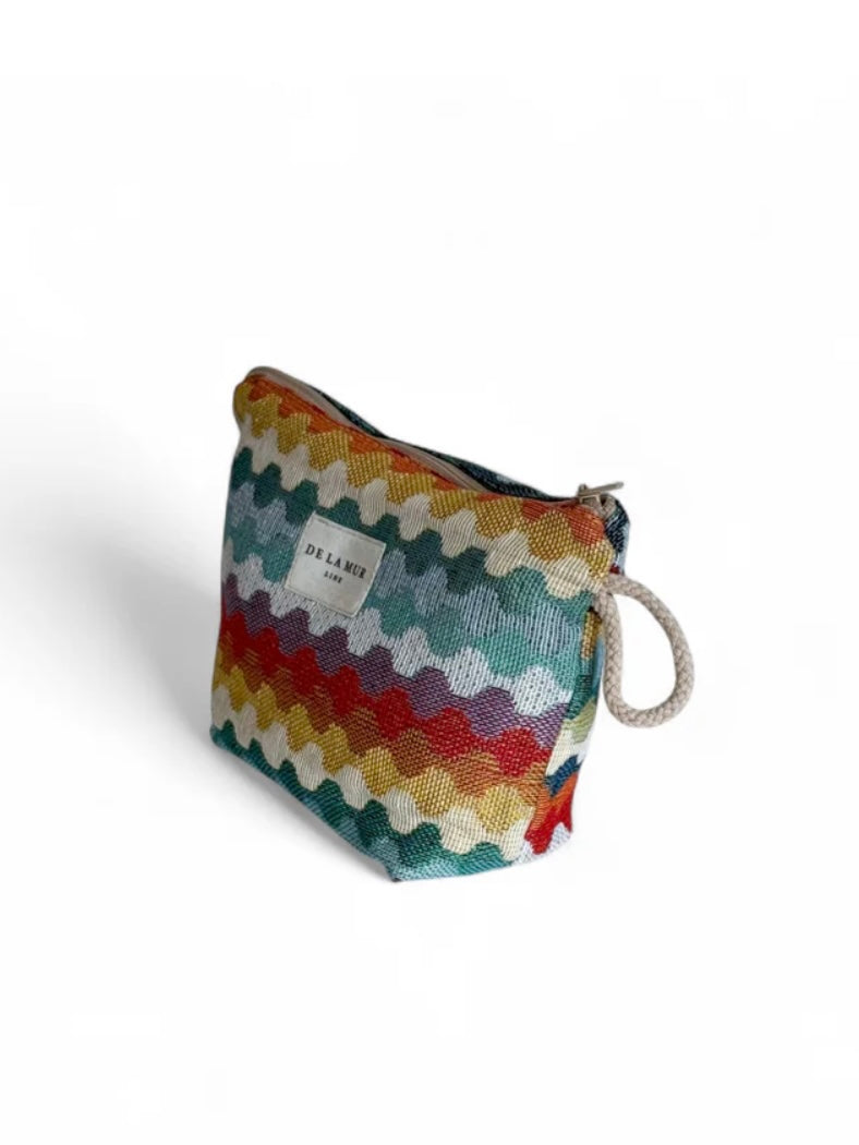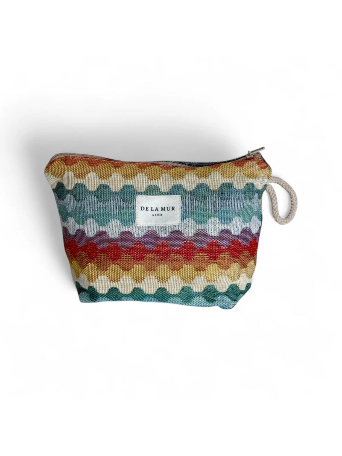 Neceser pequeño con cremallera en la parte superior y con asa lateral de cordón de color beige. Con tejido grueso de jacquard con estampado geométrico multicolor. Cada articulo puede tener una variación en el estampado, dependiendo de donde se haya efectuado el corte de la pieza. Para su correcto mantenimiento se aconseja lavarlo en frío y no utilizar secadora.