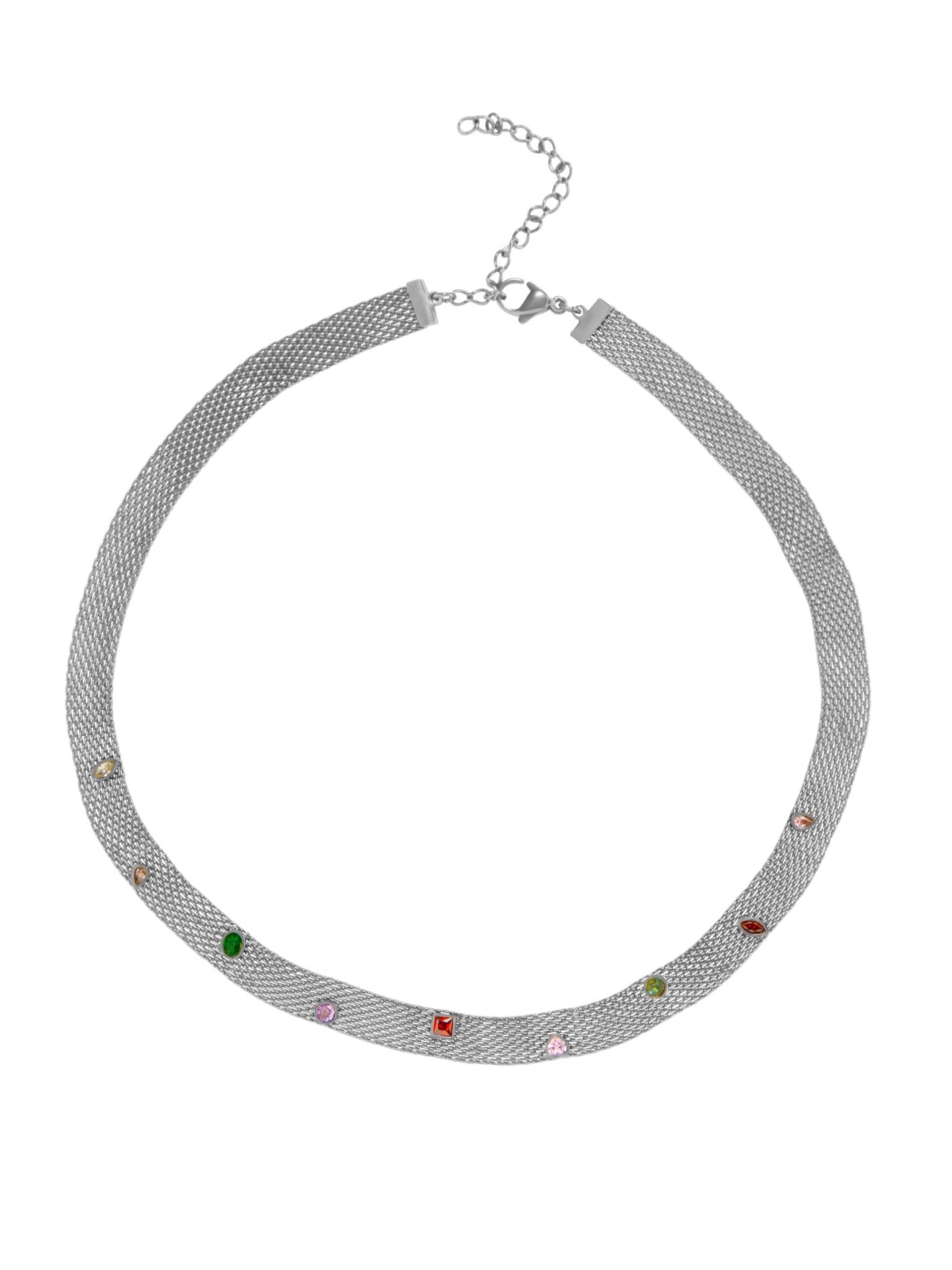 Collar tipo choker con cadena Bismarck y minerales de dierente color engarzados, para poner ajustado al cuello o más sueltecito, al gusto ya que tiene cadenita para adaptarse.