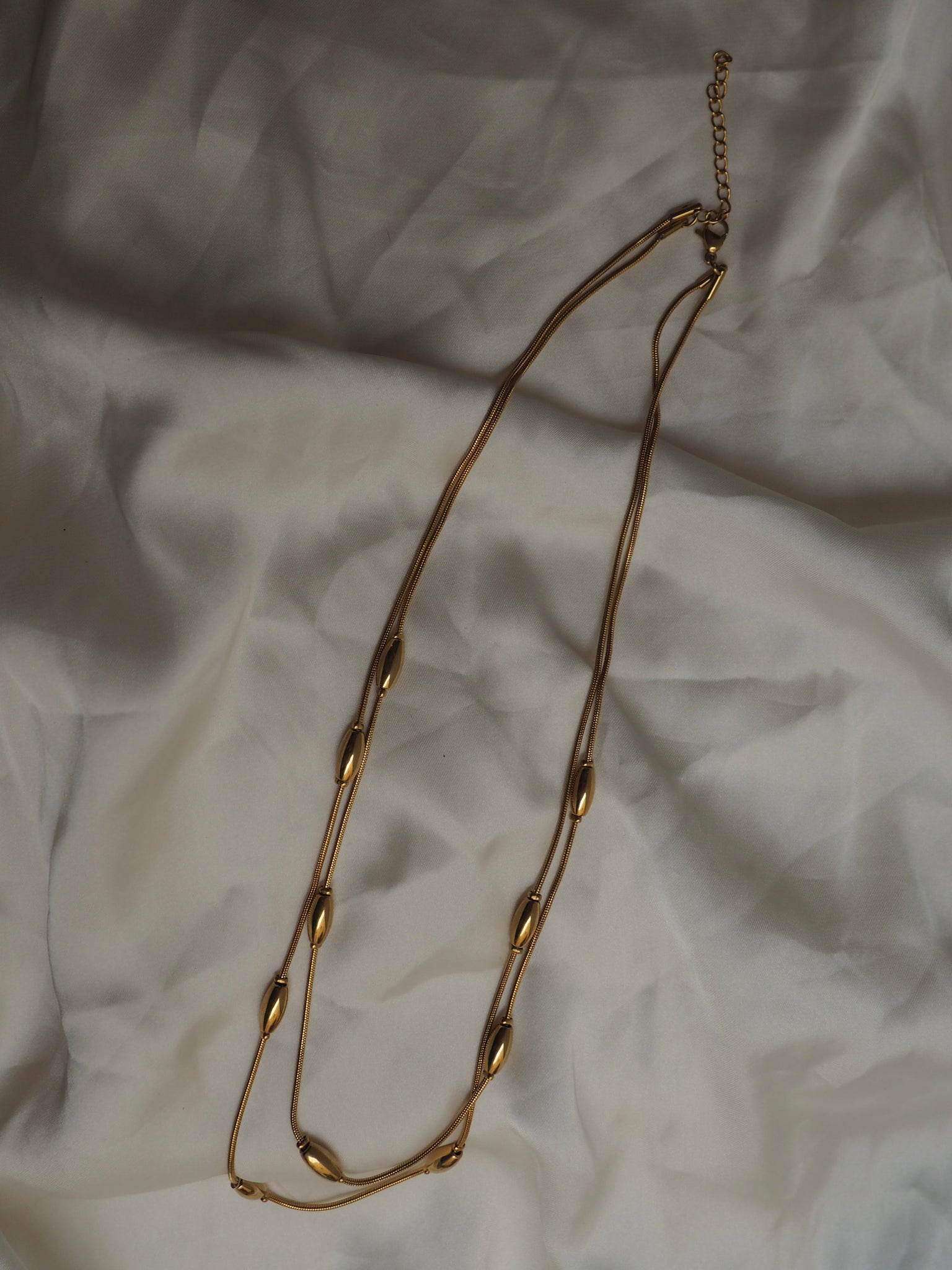 Collar con dos cadenas a diferentes alturas y detalles ovales con bolitas. Con un solo broche y alargador para llevar al gusto de largo.