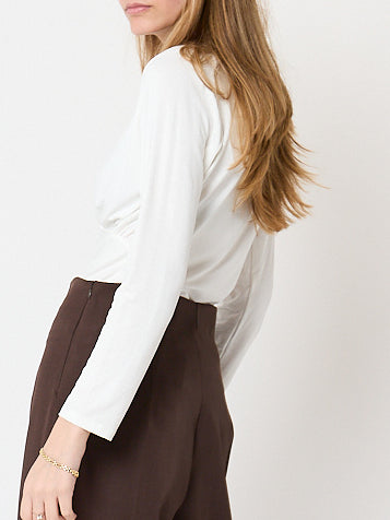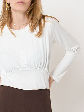Camiseta blanca básica de cuello redondo y mangalarga pero con toque especial en cintura.